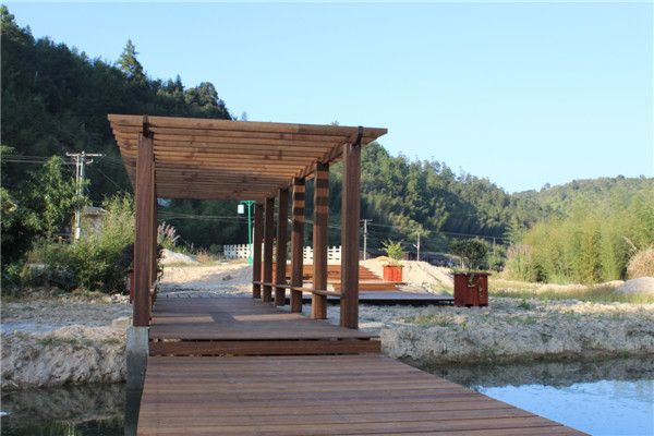 这是重竹生产中重要工序之一,可以用多种方法进行,具体要根据西安防腐木原料的特点和重竹产品的质量的要求来决定。例如以毛竹做原料时,先将竹材截成要求的长度,去掉竹青、竹黄,将竹材剖成竹篾或竹丝,竹篾的断面尺寸,例如宽8~20mm,厚0.8~1.2mm,长度据重竹长度定。毛竹也可开片、剖分、去青、软化后进行纵向辗压制成碎裂状竹丝束,竹丝束纵向不断裂,横向松散而交错相连、保持竹材纤维排列方向,该工序称为“疏解”。对小径竹,薄壁竹常采用疏解方法。