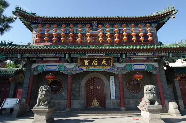 与山门对应的是青岛天后宫正殿,正殿内供奉天后---妈祖,这尊妈祖像是由整条樟木雕刻而成的,并且在妈祖故里莆田开光分灵的,是目前世上最大的木雕神像之一。