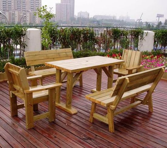 简单实用的木条打制而成,全实木桌,全实木椅子。户外桌椅带给休闲舒适之感,没有了工作上灼灼逼人的紧张感。